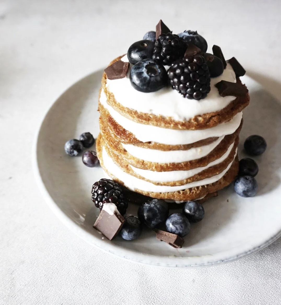 Tip: voeg wat kokosyoghurt toe voor tussen de pannenkoekjes. Super stevig en erg lekker voor het geheel! Maak af met toppings.