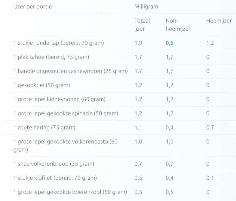 Allereerst willen we benadrukken dat bovenstaande tips voor bijna iedereen makkelijk toe te passen zijn. Daarnaast is het sowieso een goed idee om veel fruit en groenten bij de maaltijden te eten en niet teveel kaas (verzadigd vet) te eten of je nou aan je ijzerstatus wilt werken of niet. Je zou er uiteraard ook voor kunnen kiezen om af en toe vlees te gaan eten. Met name rood vlees bevat veel goed opneembaar ijzer (heemijzer), maar zoals we inmiddels weten is (dagelijks) vlees eten, en met name rood vlees eten, niet bevorderlijk voor je gezondheid*. Een ruime consumptie van ijzerrijke voedingsmiddelen zoals spinazie, peulvruchten, noten en granen is daarentegen wel gelinkt aan een goede gezondheid.