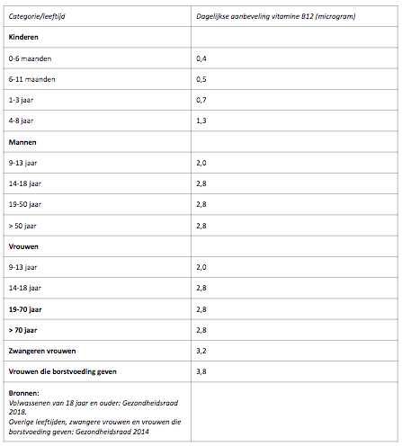 Tabel 1 Aanbevolen dagelijkse hoeveelheid vitamine B12. Bron: Het Voedingscentrum
