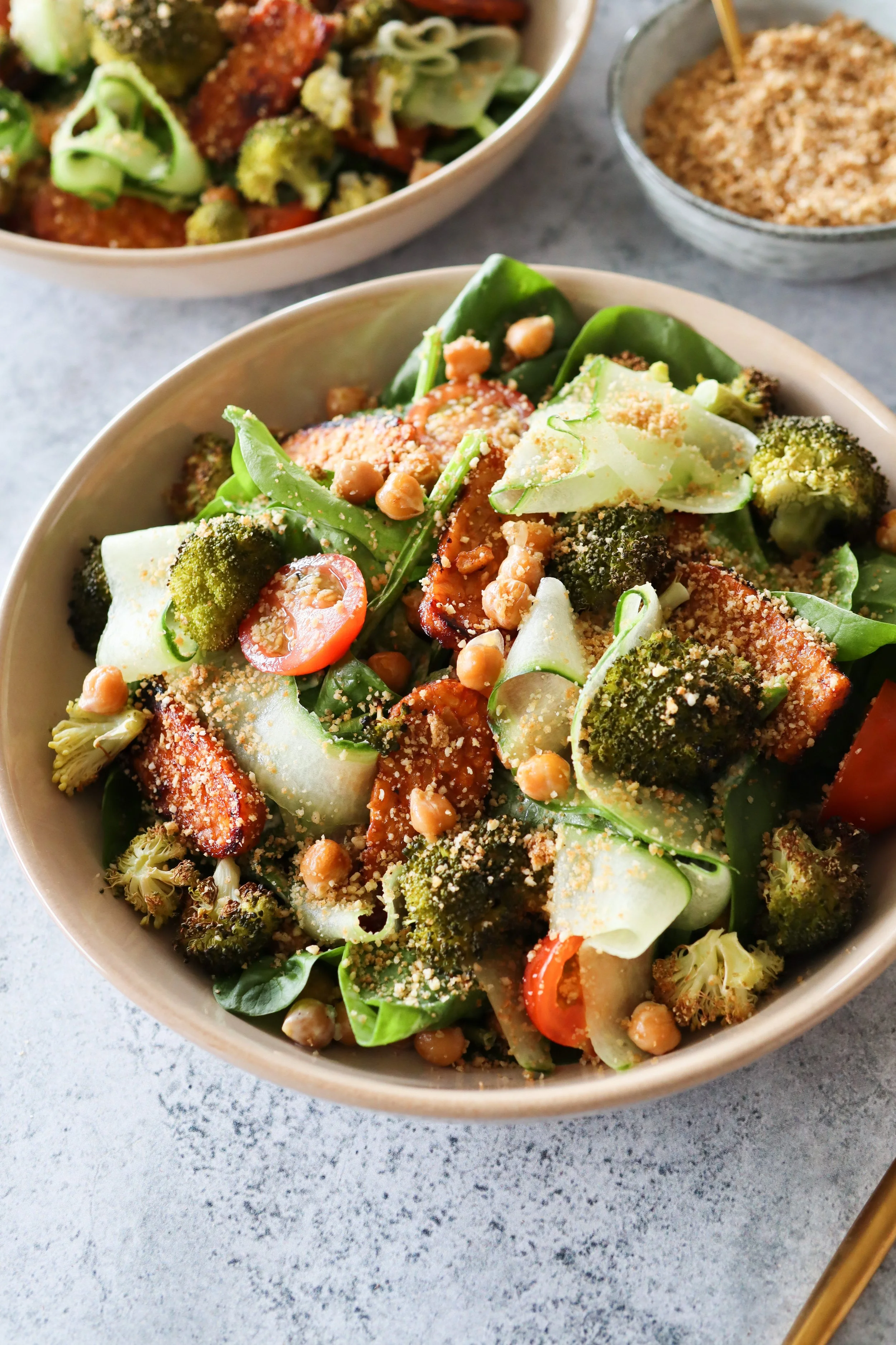 Smokey Tempeh Salade met Cashew-Parmezaan