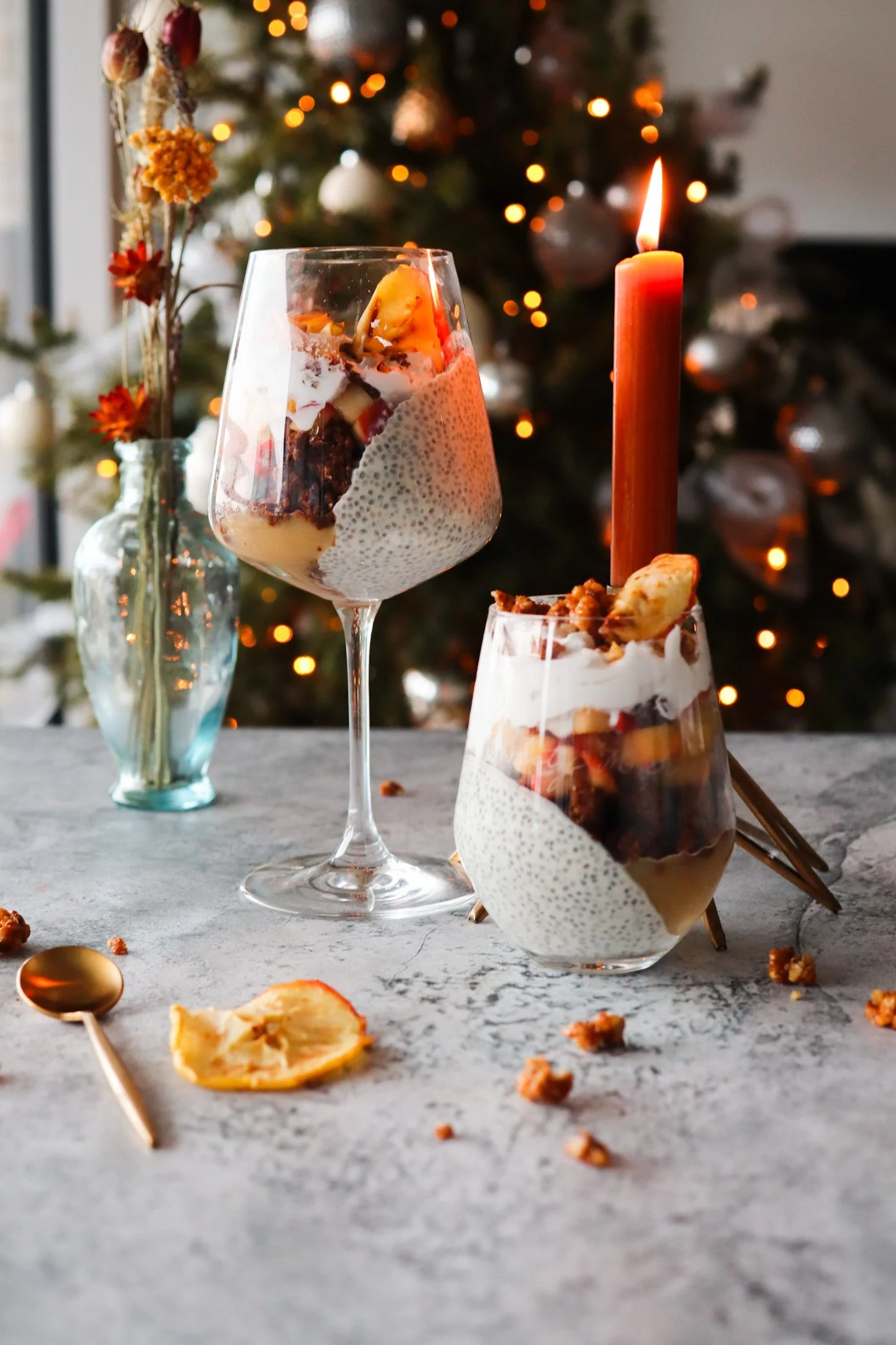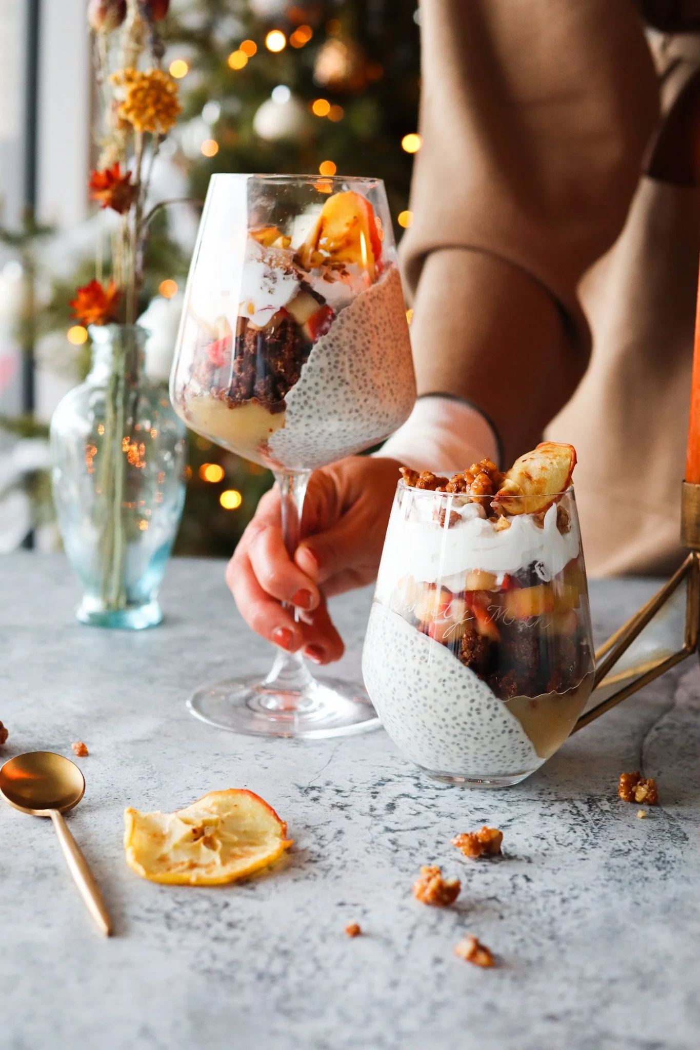 Zet de glazen met het chiazaad-yoghurt mengsel recht op en schep hier voorzichtig 2 eetlepels appelmoes op. Bouw vervolgens laagjes van 1 handje crumble, 2 eetlepels warme appelblokjes.