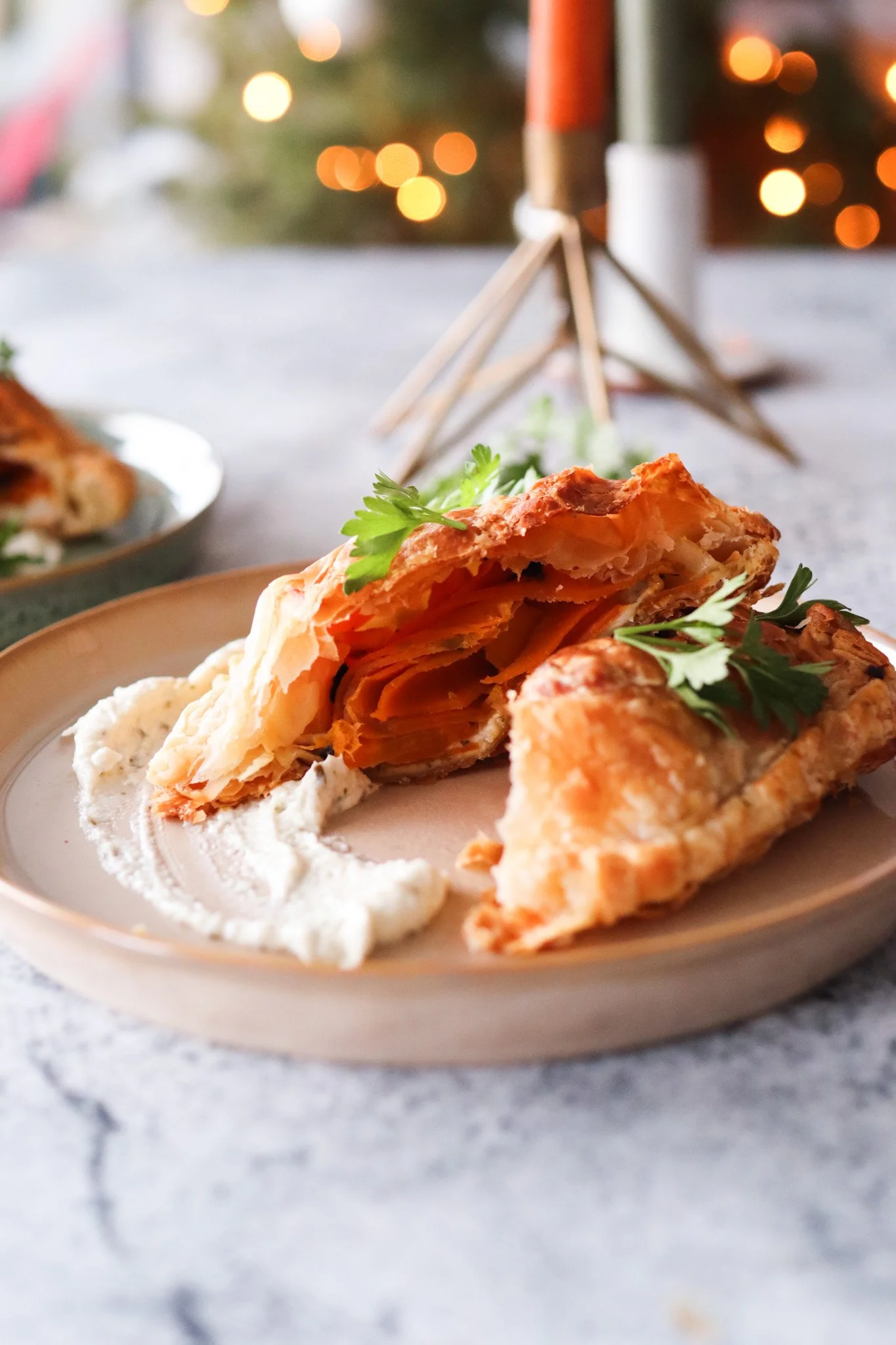 Verwarm de oven voor tot 180 graden en bekleed een bakplaat met bakpapier. Ontdooi 6 plakjes vegan bladerdeeg (let op: niet te lang, dan worden ze droog).
