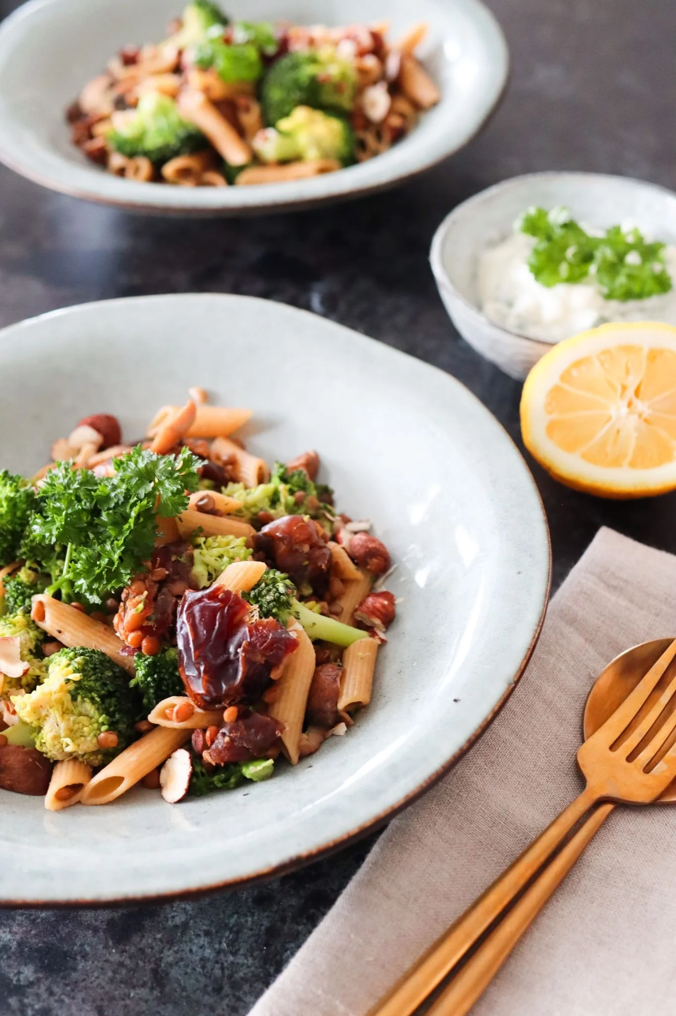 Pastasalade met linzen, dadels & hazelnoten