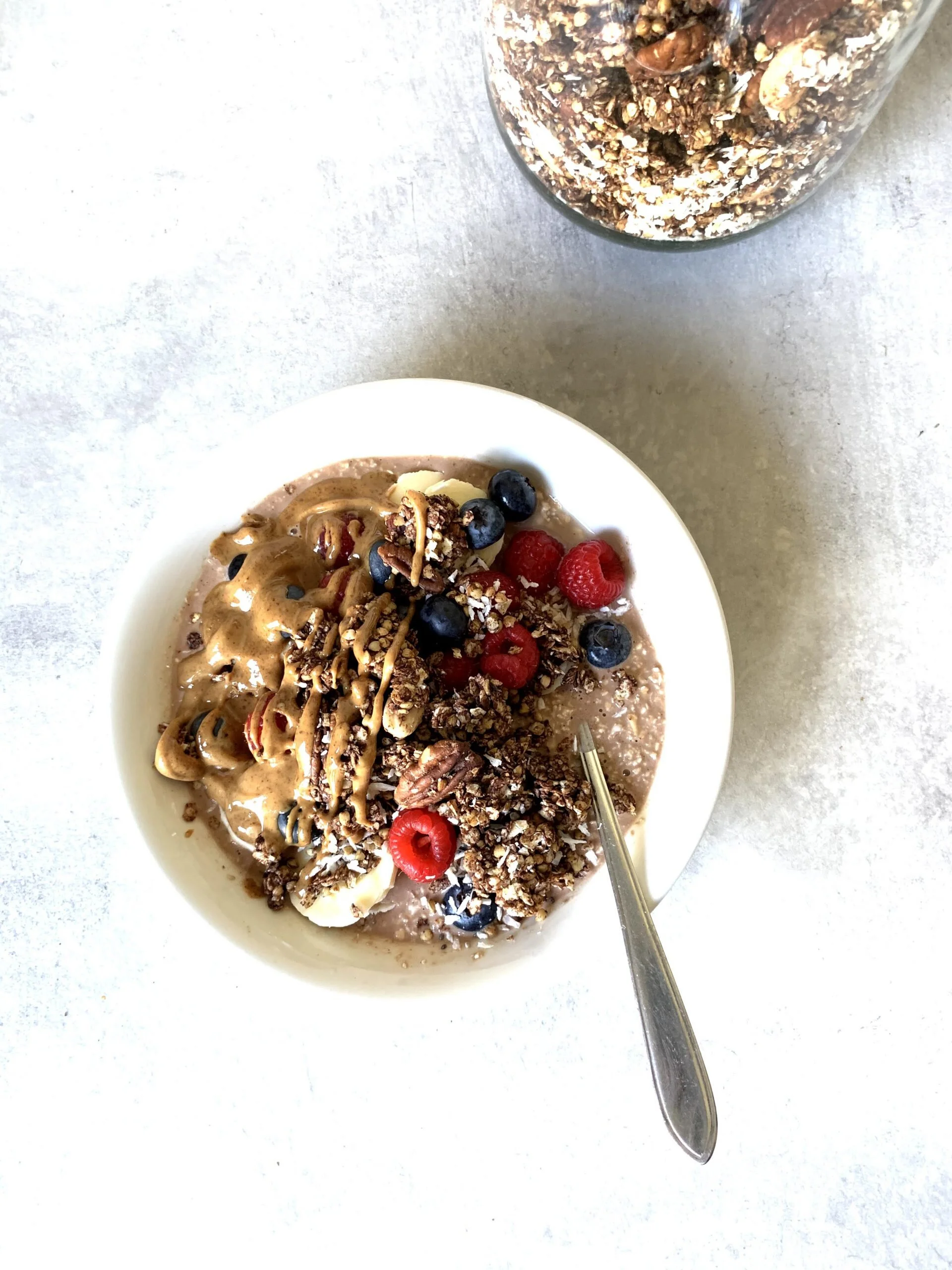 De chocolade buckini granola is heerlijk met (kokos)yoghurt en blauwe bessen of over overnight oats. Ik maak hierbij graag choco-overnight oats door 55 gram havermout minimaal een half uur (maar liefst een hele nacht) te laten weken in 150 ml havermelk en een theelepel cacaopoeder. Serveer deze overnight oats met verse blauwe bessen, frambozen, een paar plakjes banaan, een royale theelepel notenpasta en natuurlijk de chocolade buckini granola.