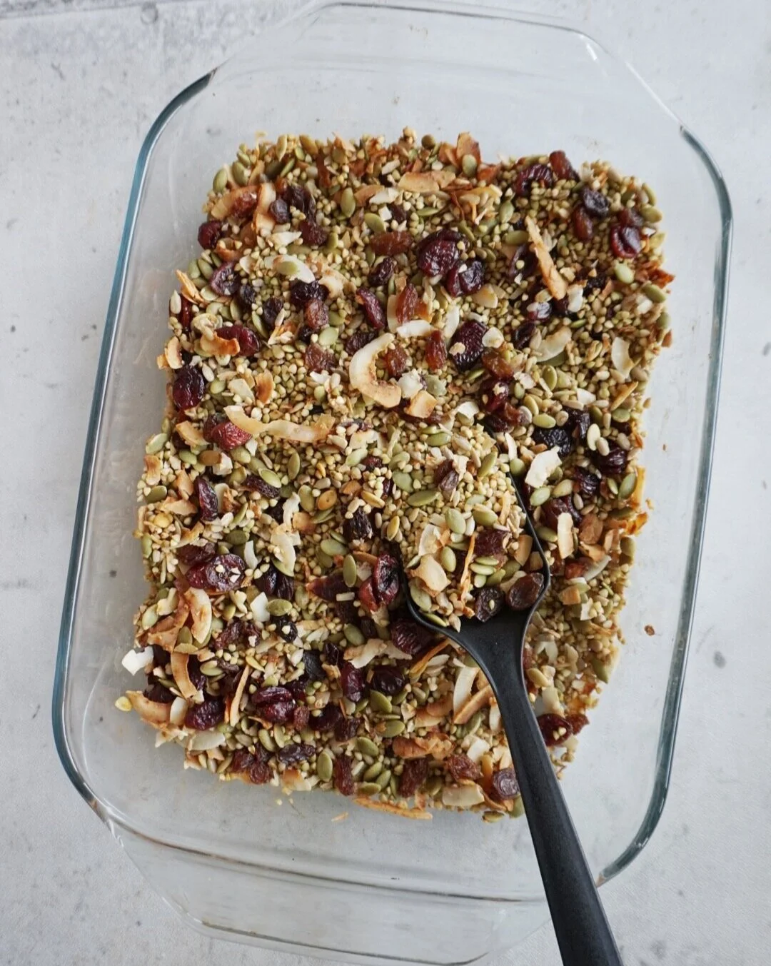 Dit granola recept is afkomstig van het boek ‘Deliciously Ella with friends’ en staat standaard bij ons op de keukenplank. Van alle granola’s is deze variant met boekweitgrutten en cranberry’s toch wel een van onze favorieten. Deze granola vond onze moeder zo lekker, dat we een mooie weckpot met deze granola cadeau deden voor haar verjaardag. We hopen dat jullie dit recept net zo verassend vinden.