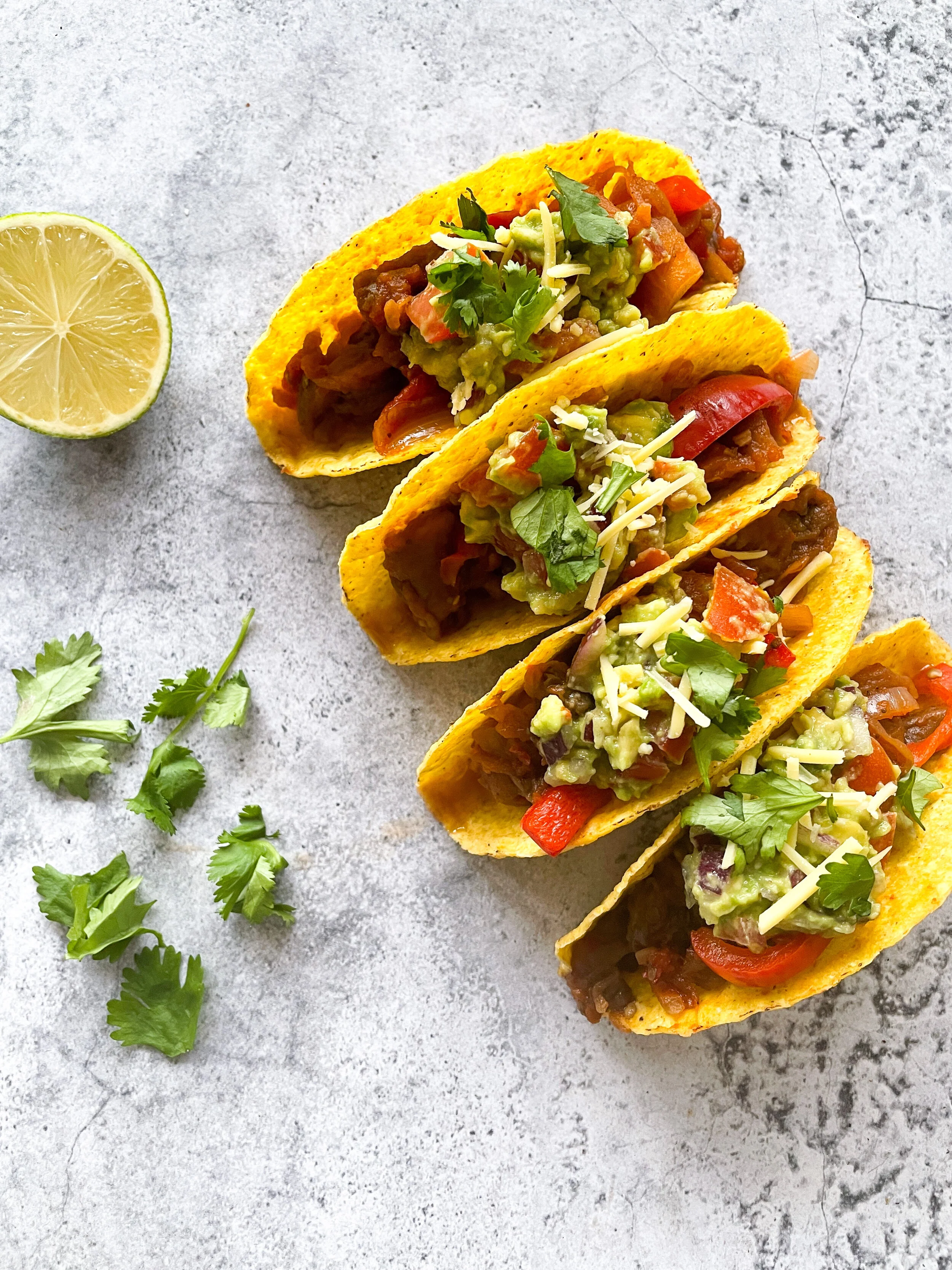 Serveer de taco’s met de auberginesaus, guacamole, kaas, verse koriander en eventueel wat extra limoen- of citroensap.